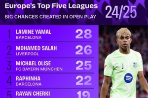 五大联赛运动战创造重大机会榜:亚马尔、萨拉赫、奥利塞前三